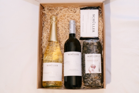 1 x Weinviertel DAC 2024, 1 x Gelber Muskateller Frizzante, 1 x Weinschokolade, 500 g Kürbiskerne im schönen Pappkarton mit Holzwolle.